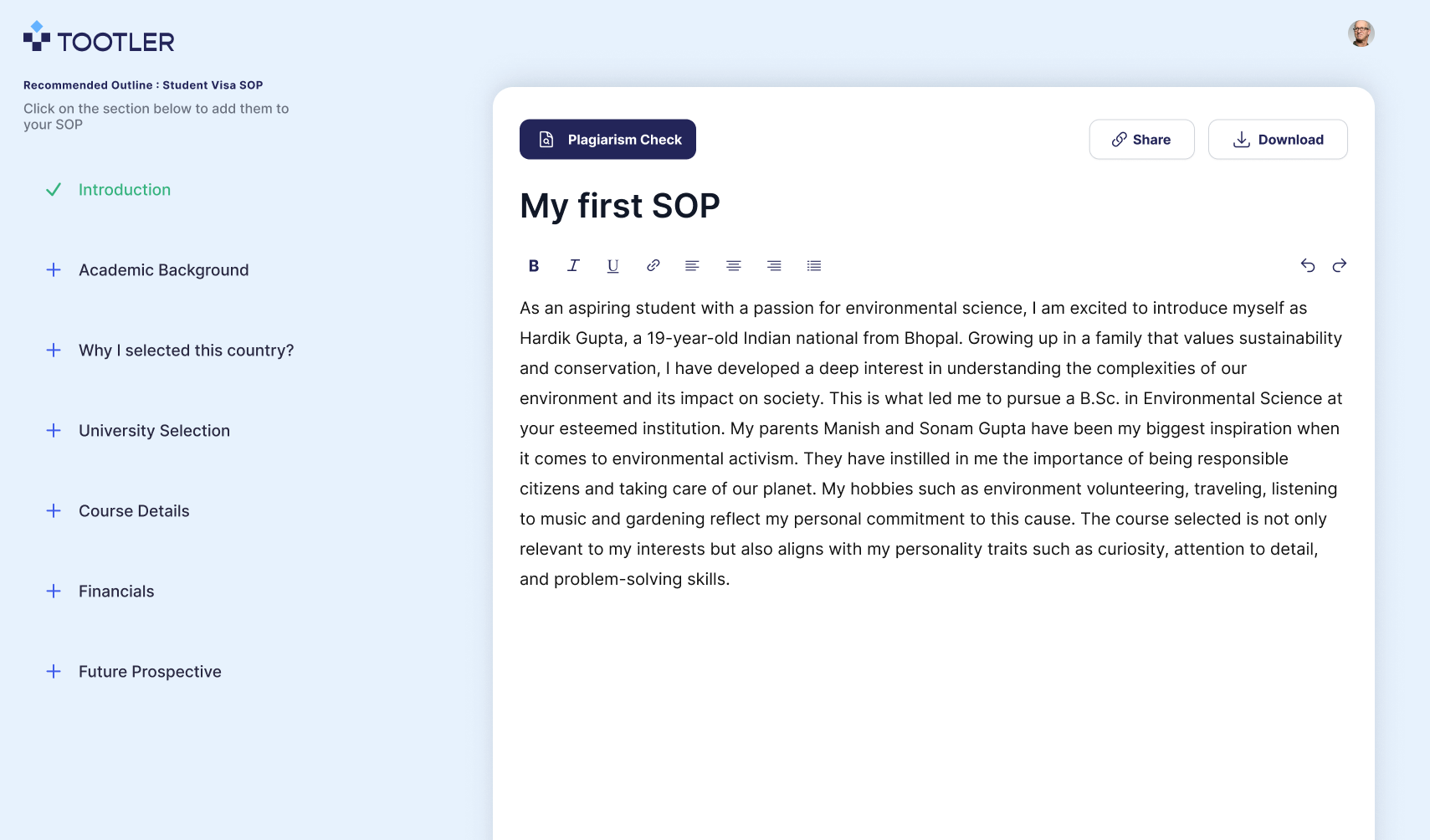 Tootler is a platform that helps you write SOPs for your dream colleges. It is a one-stop solution for all your SOP needs.